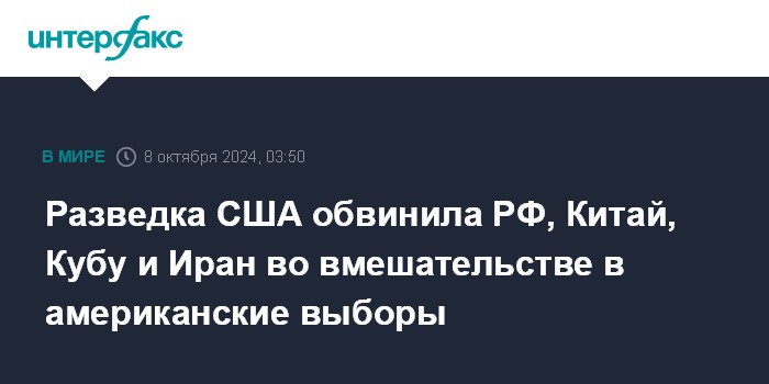 Москва. 8 октября. INTERFAX.RU - Чиновник из канцелярии директора Национальной разведки выступил в понедельник с утверждением, что Россия, Китай, Куба и Иран "активизировали попытки вмешательства" в выборы президента и Конгресс США, сообщают американские СМИ.
