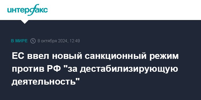 Москва. 8 октября. INTERFAX.RU - Совет ЕС утвердил во вторник новый режим санкций в отношении РФ "за дестабилизирующую деятельность против ЕС и его государств-членов".