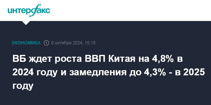 Москва. 8 октября. INTERFAX.RU - Всемирный банк подтвердил прогноз роста ВВП Китая на 2024 год на уровне 4,8% и улучшил прогноз на 2025 год до 4,3% с ожидавшихся в июне 4,1%.
