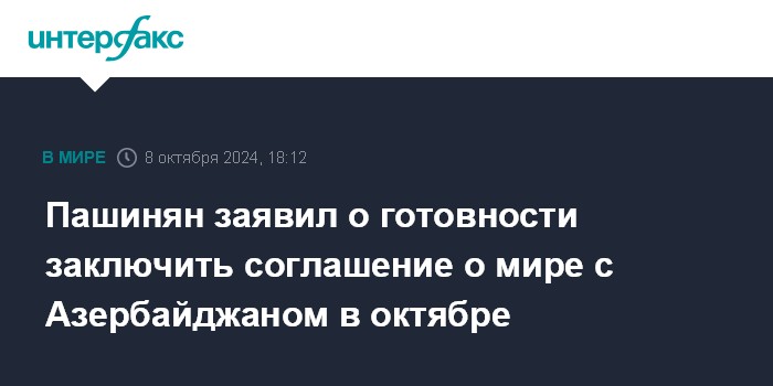 Москва. 8 октября. INTERFAX.RU - Армения готова подписать соглашение о мире с Азербайджаном в течение октября, заявил премьер-министр республики Никол Пашинян.