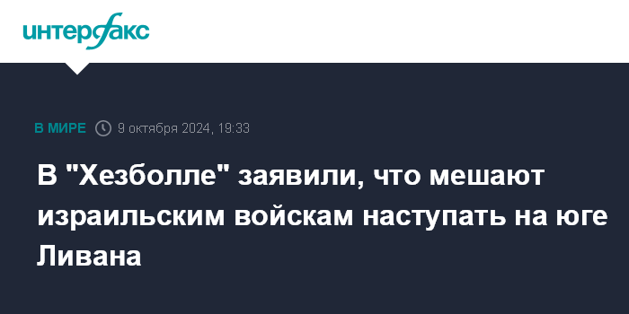 Москва. 9 октября. INTERFAX.RU - В движении "Хезболла" в среду заявили, что его бойцы сдерживают наступление израильских войск в ходе боев вдоль ливанско-израильской границы, передают западные СМИ.