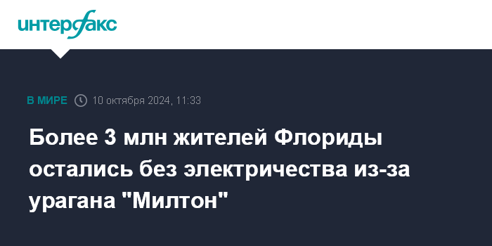 Москва. 10 октября. INTERFAX.RU - Обрушившийся на американский штат Флорида ураган "Милтон" вызвал отключение электричества у более 3 млн человек, свидетельствуют данные сайта PowerOutage.us.