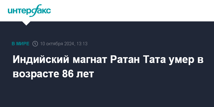 Москва. 10 октября. INTERFAX.RU - В Индии умер бизнесмен Ратан Тата, более двух десятилетий возглавлявший семейный конгломерат Tata Group, правнук основателя компании, сообщает ВВС со ссылкой на пресс-релиз Tata Group. Ему было 86 лет.