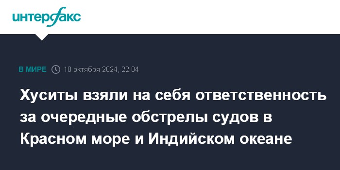 Москва. 10 октября. INTERFAX.RU - Йеменские хуситы в четверг взяли на себя ответственность за обстрел двух судов в Красном море и в Индийском океане.