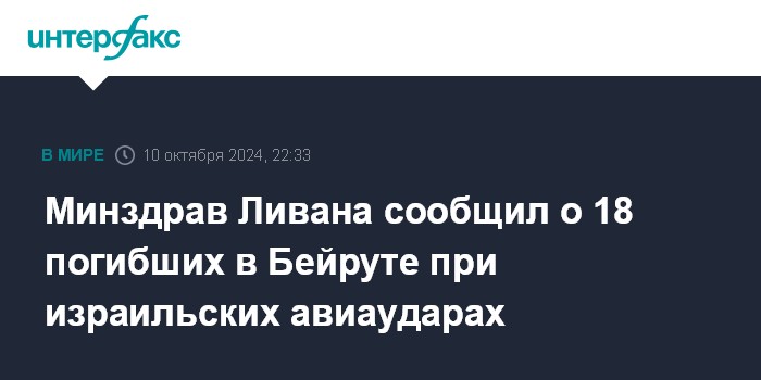 Москва. 10 октября. INTERFAX.RU - Жертвами израильских авиаударов по центральным районам Бейрута в четверг стали не менее 18 человек, сообщает телеканал "Аль-Майядин" со ссылкой на Минздрав Ливана.