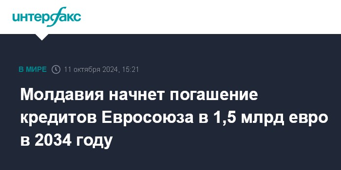 Москва. 11 октября. INTERFAX.RU - Погашение кредитов в 1,5 млрд евро, которые будут предоставлены Евросоюзом в 2025-2027 годах. в рамках Плана экономического роста Молдавии на пути интеграции в ЕС, начнется через 10 лет, в 2034 году, период выплаты - до 40 лет, сообщает делегация ЕС в Кишиневе.