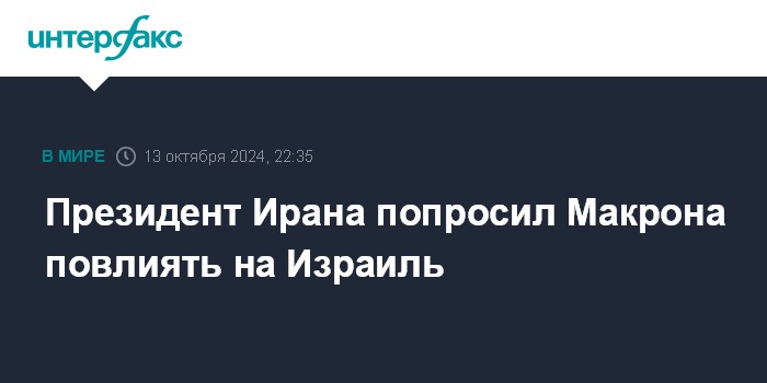 Москва. 13 октября. INTERFAX.RU - Президент Ирана Масуд Пезешкиан в воскресенье в ходе телефонного разговора со своим французским коллегой Эммануэлем Макроном призвал Париж оказать влияние на Израиль, сообщает агентство "Мехр".