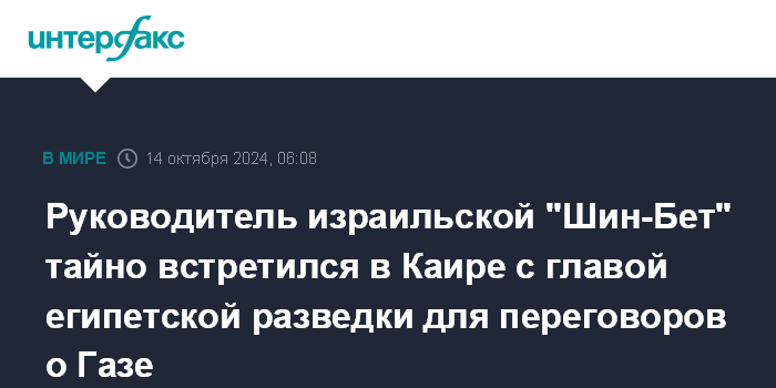 Москва. 14 октября. INTERFAX.RU - Руководитель службы общей безопасности Израиля ("Шин-Бет") Ронен Бар в воскресенье тайно посетил Каир, где встретился с главой египетской разведки Аббасом Камелем, сообщает портал Walla!