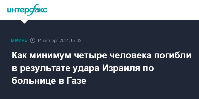 Москва. 14 октября. INTERFAX.RU - По меньшей мере четыре человека погибли и 70 получили ранения в результате удара по больнице в городе Дейр-эль-Балах в секторе Газа, сообщают арабские СМИ.