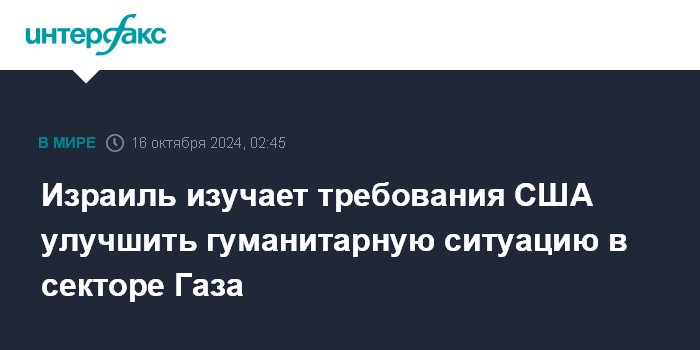 Москва. 16 октября. INTERFAX.RU - Израиль тщательно изучает письмо властей США с призывом улучшить гуманитарную ситуацию в секторе Газа и намерен обсудить проблемы с американскими коллегами, сообщает Axios со ссылкой на израильского чиновника.