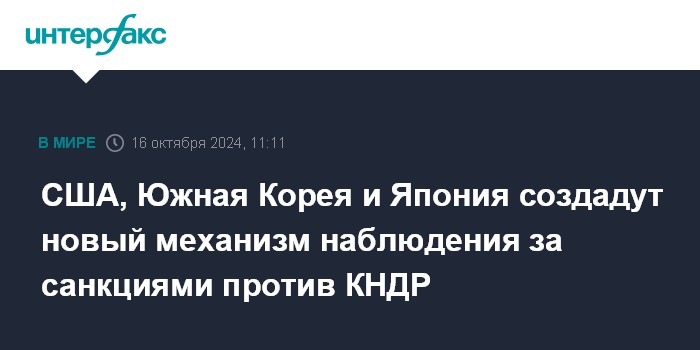 Москва. 16 октября. INTERFAX.RU - США, Южная Корея и Япония учредят новый механизм с целью следить за соблюдением санкций в отношении КНДР, сообщило агентство "Рёнхап" в среду со ссылкой на южнокорейский МИД.