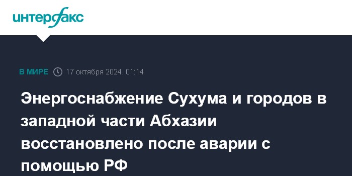 Энергоснабжение Сухума и городов в западной части Абхазии восстановлено после аварии с помощью РФ