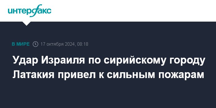 Москва. 17 октября. INTERFAX.RU - Авиаудар Израиля по сирийскому городу Латакия рано утром в четверг вызвал сильные пожары, сообщает агентство SANA.