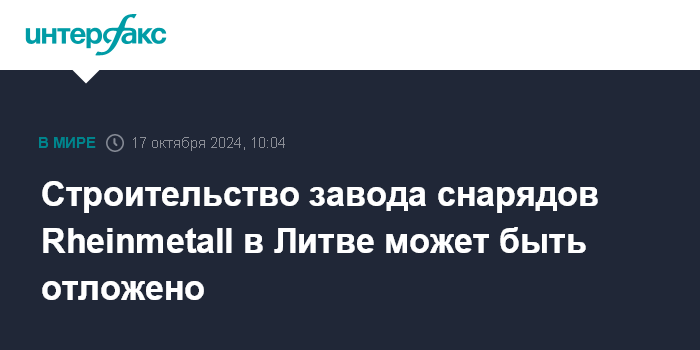Москва. 17 октября. INTERFAX.RU - Начало строительства германским концерном Rheinmetall завода в Литве по выпуску снарядов может запаздывать из-за продолжающихся переговоров литовских властей и компании, заявила агентству BNS премьер-министр страны Ингрида Шимоните.