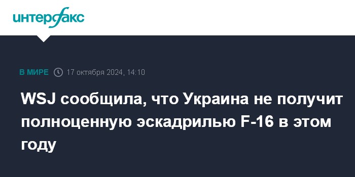 Москва. 17 октября. INTERFAX.RU - Украина не будет располагать полноценной эскадрильей истребителей F-16, обещанных ей Западом, к концу года, сообщила в четверг газета The Wall Street Journal, ссылаясь на американские официальные лица.