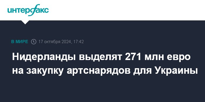 Москва. 17 октября. INTERFAX.RU - Премьер-министр Нидерландов Дик Схооф объявил о решении выделить 271 млн евро на приобретение артиллерийских снарядов для Украины. Он написал об этом в соцсетях.