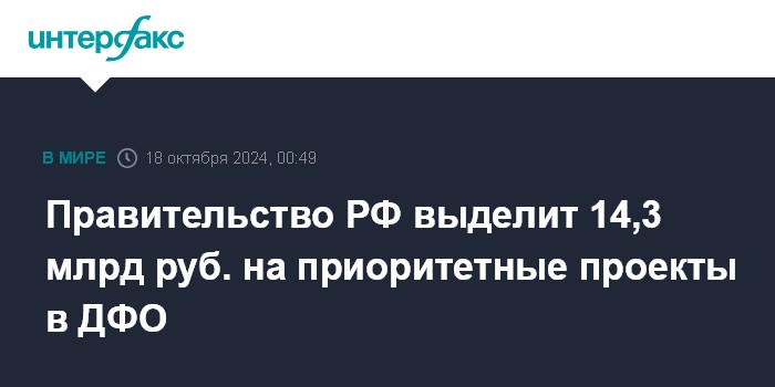 Москва. 18 октября. INTERFAX.RU - Правительство РФ выделит более 14,3 млрд рублей на реализацию приоритетных инвестпроектов в Дальневосточном федеральном округе (ДФО), а также на субсидирование перевозок по Северному морскому пути (СМП), говорится в сообщении на сайте кабинета министров.