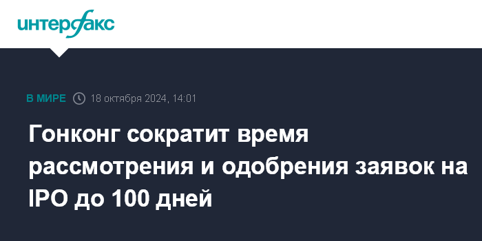 Москва. 18 октября. INTERFAX.RU - Гонконгская биржа и регулятор фондового рынка сократят до 100 дней процесс рассмотрения и одобрения заявок компаний на проведение IPO.