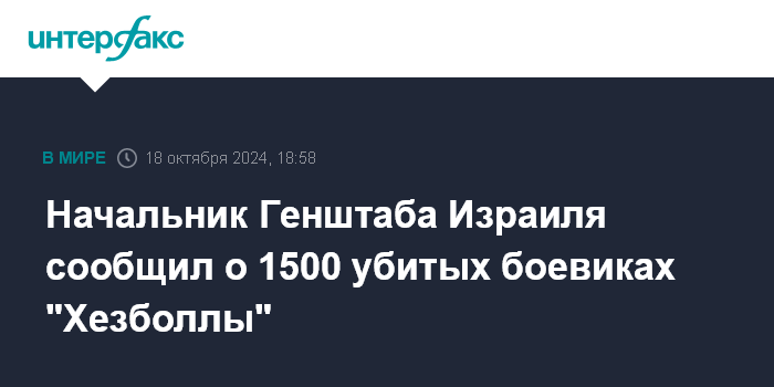 Москва. 18 октября. INTERFAX.RU - В результате действий израильских военных убиты около полутора тысяч боевиков ливанского шиитского движения "Хезболла", заявил начальник Генштаба ЦАХАЛ Герци Халеви. Его слова приводит телеграм-канал ЦАХАЛа.