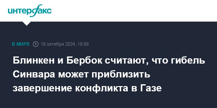 Москва. 18 октября. INTERFAX.RU - Гибель главы политбюро ХАМАС Яхьи Синвара может создать импульс для завершения конфликта Израиля и палестинцев в секторе Газа, заявили главы внешнеполитических ведомств США и Германии Энтони Блинкен и Анналена Бербок.