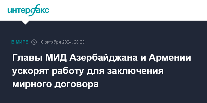 Москва. 18 октября. INTERFAX.RU - Главы МИД Азербайджана и Армении Джейхун Байрамов и Арарат Мирзоян на переговорах в Стамбуле обсудили мирный договор между Баку и Ереваном.