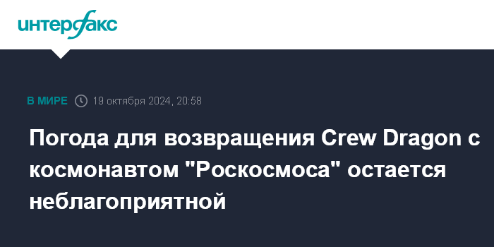 Москва. 19 октября. INTERFAX.RU - Погодные условия для приводнения после расстыковки корабля Crew Dragon-8 компании SpaceX с космонавтом "Роскосмоса" Александром Гребенкиным в составе экипажа с МКС на данный момент остаются неблагоприятными, сообщает НАСА.