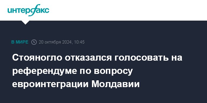 Москва. 20 октября. INTERFAX.RU - Независимый кандидат на пост президента Молдавии Александр Стояногло заявил, что отказался участвовать в конституционном референдуме по вопросу европейской интеграции.