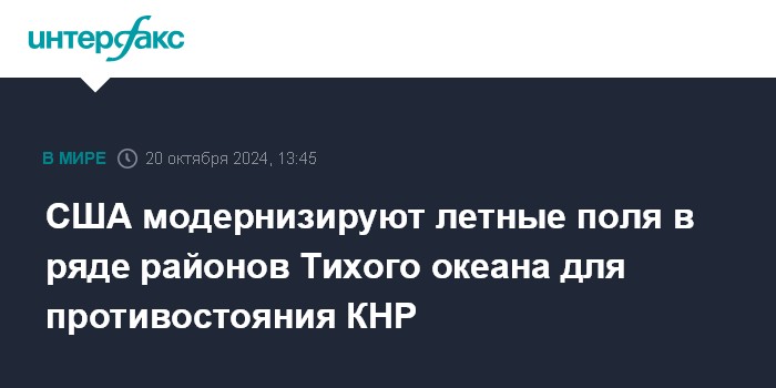 Москва. 20 октября. INTERFAX.RU - Военные США ведут модернизацию взлетно-посадочных полос в различных районах Тихого океана, чтобы иметь возможность рассредоточить боевую авиацию и повысить ее шансы на выживаемость при гипотетическом конфликте с КНР, сообщает The Wall Street Journal (WSJ).