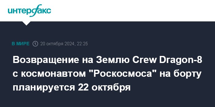 Возвращение на Землю Crew Dragon-8 с космонавтом "Роскосмоса" на борту планируется 22 октября