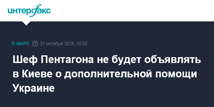 Москва. 21 октября. INTERFAX.RU - Министр обороны США Ллойд Остин, который находится на Украине, в ходе этого визита не будет объявлять о выделении новых пакетов военной помощи или о разрешении на использование американских дальнобойных ракет против России, сообщил источник The Wall Street Journal.