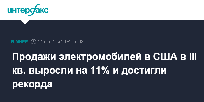 Москва. 21 октября. INTERFAX.RU - Продажи электромобилей в США в третьем квартале выросли на 10,7% относительно того же периода прошлого года и достигли рекордных 346 408 штук, сообщает Cox Automotive.