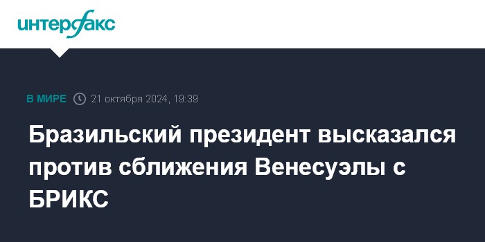 Москва. 21 октября. INTERFAX.RU - Президент Бразилии Луис Инасиу Лула да Силва выступил против дальнейшего сближения Венесуэлы с группой БРИКС, сообщает в понедельник бразильский медиахолдинг Globo.