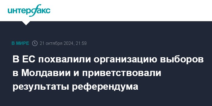 Москва. 21 октября. INTERFAX.RU - В Евросоюзе отметили хорошую организацию президентских выборов в Молдавии и конституционного референдума по вопросу европейской интеграции страны.