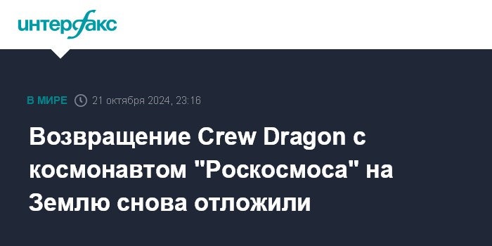 Москва. 21 октября. INTERFAX.RU - Отстыковка космического корабля Crew Dragon-8 компании SpaceX с экипажем из трех астронавтов и космонавта "Роскосмоса" Александра Гребенкина от Международной космической станции (МКС) для возвращения на Землю, планировавшаяся во вторник по московскому времени, отложена из-за непогоды в районе приводнения, сообщило в понедельник NASA.