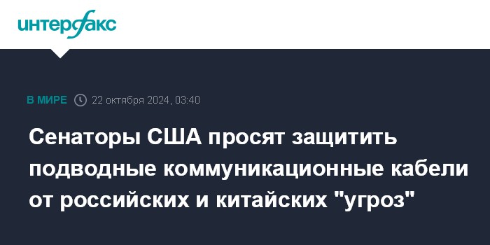 Москва. 22 октября. INTERFAX.RU - Двухпартийная группа американских сенаторов обратилась к президенту США Джо Байдену с просьбой улучшить защиту критически важных энергетических и коммуникационных подводных кабелей от потенциальных "угроз" со стороны РФ и Китая.