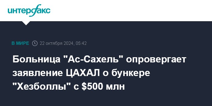 Накануне представитель ЦАХАЛ Даниэль Хагари заявил на брифинге, что бункер "Хезболлы" с $500 млн расположен непосредственно под больницей "Ас-Сахель" в бейрутском районе Дахия.