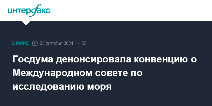 Москва. 22 октября. INTERFAX.RU - Госдума на заседании во вторник проголосовала за денонсацию конвенции о Международном совете по исследованию моря.