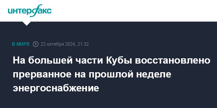 Москва. 22 октября. INTERFAX.RU - Более 70% территории Кубы вновь подключено к системе энергоснабжения, сообщает во вторник кубинская энергетическая компания Union Еlectrica.