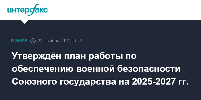 Москва. 23 октября. INTERFAX.RU - План работы по обеспечению военной безопасности Союзного государства России и Белоруссии на 2025-2027 годы утверждён в ходе заседания совместной коллегии министерств обороны двух стран, которое прошло в Минске в среду, сообщил министр обороны РФ Андрей Белоусов.