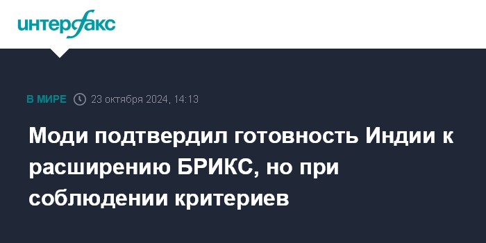 Москва. 23 октября. INTERFAX.RU - Премьер-министр Индии Нарендра Моди в среду заявил, что согласованные на саммите БРИКС в Йоханнесбурге в 2023 году принципы и критерии для вступления новых членов в это объединение необходимо соблюдать, сообщает издание The Economic Times.