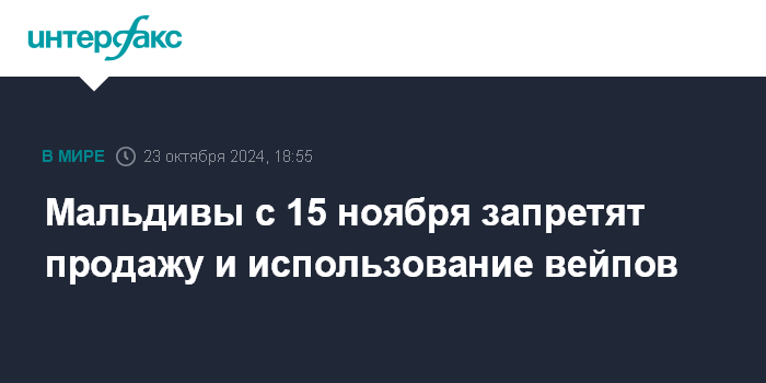 Москва. 23 октября. INTERFAX.RU - Власти Мальдив запретили ввоз, использование, хранение, распространение электронных сигарет и продукции для этой индустрии, нововведение вступит в силу с 15 ноября, сообщает портал Аvas.