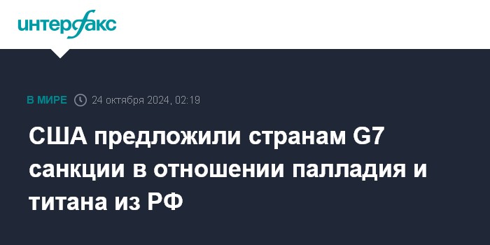 Москва. 24 октября. INTERFAX.RU - США просят государства G7 рассмотреть вопрос о санкциях в отношении российского палладия и титана, сообщает Bloomberg со ссылкой на осведомленный источник.