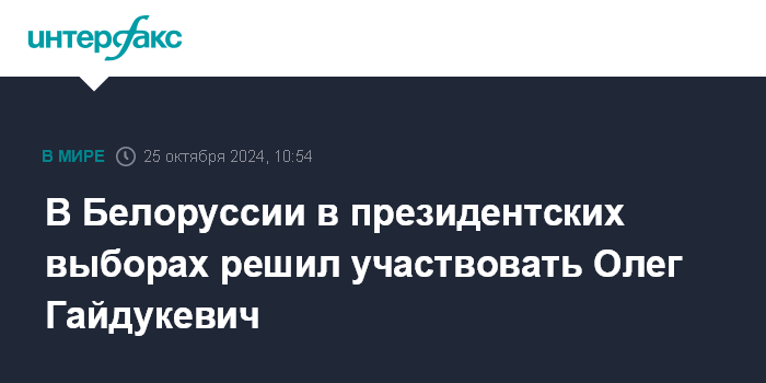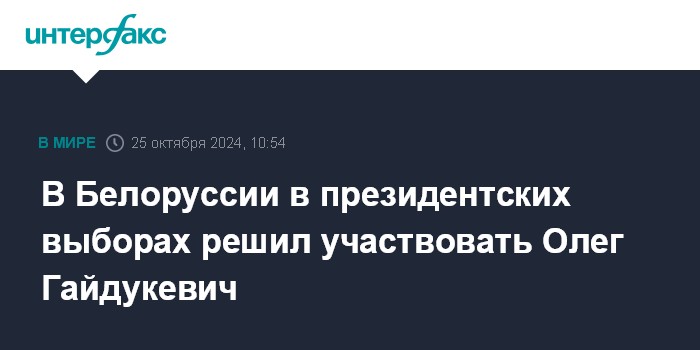Москва. 25 октября. INTERFAX.RU - Председатель Либерально-демократической партии Белоруссии (ЛДПБ) Олег Гайдукевич заявил телеканалу т"Первый информационный", что решил участвовать в президентских выборах и выдвинется от своей партии.