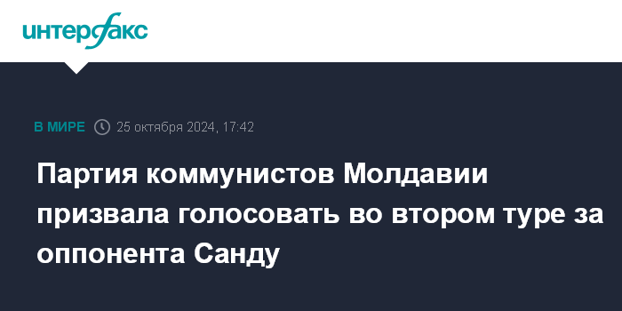 Москва. 25 октября. INTERFAX.RU - Партия коммунистов Молдавии (ПКРМ) призвала своих сторонников во втором туре президентских выборов проголосовать против нынешнего главы государства Майи Санду - за экс-генпрокурора Александра Стояногло.