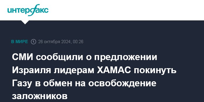 Москва. 26 октября. INTERFAX.RU - Руководитель израильской спецслужбы "Моссад" Давид Барнеа через египетских посредников сообщил о готовности Израиля дать лидерам палестинской группировки ХАМАС шанс безопасно покинуть сектор Газа в обмен на прекращение огня и освобождение заложников, но они отказались, сообщает в пятницу The Wall Street Journal (WSJ) со ссылкой на источники.