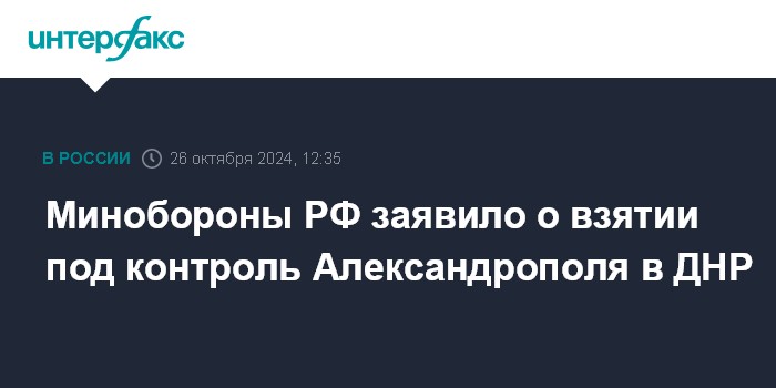 Москва. 26 октября. INTERFAX.RU - Подразделения "Южной" группировки войск установили контроль над населенным пунктом Александрополь в ДНР, заявили в Минобороны РФ в субботу.