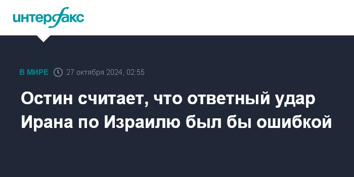 Москва. 27 октября. INTERFAX.RU - Министр обороны США Ллойд Остин в контексте обсуждения с израильским коллегой Йоавом Галантом по телефону атак Израиля на иранские объекты заявил, что ответный удар Ирана был бы ошибкой, сообщил Пентагон.