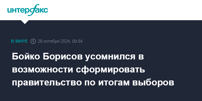 Москва. 28 октября. INTERFAX.RU - Бойко Борисов, лидер консервативной правоцентристской коалиции ГЕРБ-СДС, ставшей фаворитом на досрочных парламентских выборах в Болгарии, скептически отнесся к возможности формирования правительства в складывающихся условиях. Об этом сообщает Болгарское национальное телевидение.