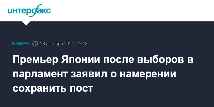 Москва. 28 октября. INTERFAX.RU - Премьер Японии Сигэру Исиба после выборов, на которых его Либерально-демократическая партия (ЛДП) и союзная "Комэйто" лишились большинства в нижней палате парламента, заявил, что не намерен покидать пост.