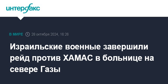 Москва. 28 октября. INTERFAX.RU - Армия обороны Израиля (ЦАХАЛ) сообщила о завершении рейда на севере сектора Газа на территории больницы "Камаль Адван", которая, по данным израильской стороны, служила командным пунктом группировки ХАМАС, сообщает в понедельник The Times of Israel.